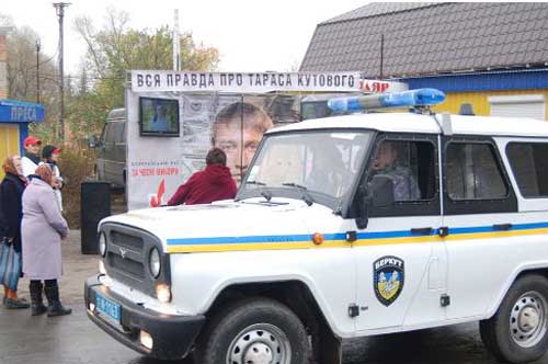 За допомогою двох великих плазмових панелей крутили фільм, спрямований на підрив репутації найрейтинговішого єдиного опозиційного кандидата в народні депутати України по виборчому округу № 151 Тараса Кутового. Цього ж дня цей же фільм показували й по інших райцентрах.
