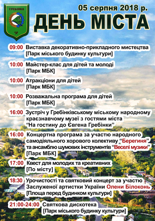 5 серпня 2018 року розпочнуться загальноміські заходи з нагоди відзначення Дня міста Гребінка.