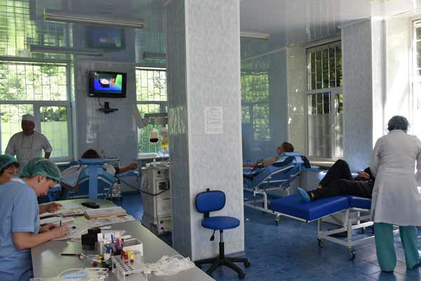 Донор приходить до станції переливання крові маючи з собою паспорт та ідентифікаційний код підходить до реєстратури, де його реєструють на направляють на прийом до терапевта. ![]() Лікар спілкується з ним щодо захворювань, вимірює артеріальний тиск, вагу, зріст, при нормальних показниках йде вимірювати рівень гемоглобіну та визначати групу крові. ![]() Далі донор п’є чай з печивом і йде у донорську залу здавати кров. ЧИТАЙТЕ ТАКОЖ: На Полтавщині затримано злочинну групу, яка спеціалізувалася крадіжками з помешкань громадян Здавши кров повертається до реєстратури, де йому відмічають здачу крові й відшкодовують кошти за харчування. На цьому місія донора закінчується. ![]() Далі відбувається цілий виробничий процес: забір крові, переробка шляхом центрифугування, тестування та інші процеси. “Протягом тижня лише з Полтавської станції видається близько 50 літрів еритроцитів на лікувальні заходи. Взагалі в області за рік заготовляється 9,5 тисяч літрів крові та 20 тисяч донацій. Потреба у крові є постійно, адже компоненти крові мають різний термін придатності: еритроцити — зберігання 35 — 42 дні, свіжозаморожена плазма — 2 роки”, – повідомив головний лікар Полтавської обласної станції переливання крові Володимир Рудіков.