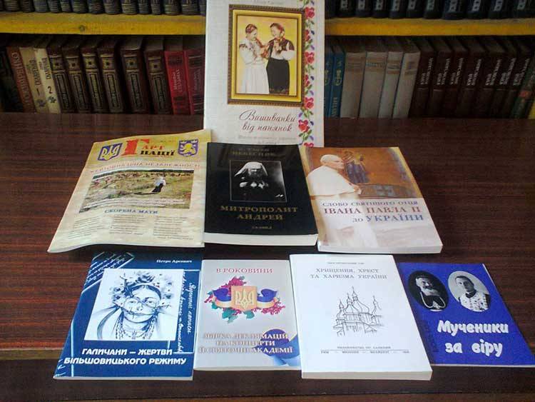 Зокрема чудове ілюстроване видання "Вишиванки від панянок" Ольги Савчин. Духовна література представленна виданнями О.Євгена Небесняка "Митрополит Андрей ", Слово Святішого отця Івана Павлова до України ", Василь Бабій " Мученики за віру ".