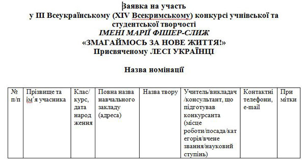 Школярів Гребінківщини запрошують зареєструватися для участі у Всеукраїнському фестивалі-конкурсу учнівської та студентської творчості імені Марії Фішер-Слиж «Змагаймось за нове життя!», присвяченого Лесі Українці. Про це повідомляє відділ освіти, молоді та спорту Гребінківської райдержадміністрації.Конкурс проводиться з метою сприяння глибшому ознайомленню та вивченню молоддю спадщини великої української поетеси Лесі Українки; долучення підростаючого покоління до збереження і розвитку культурної спадщини українського народу шляхом вивчення історії рідного краю; виховання почуття патріотизму, національної гідності та особистої відповідальності за майбутнє. Конкурс проводять у чотирьох вікових категоріях: серед учнів 1-4 класів, 5-7 класів, 8-9 класів, серед учнів 10-11 класів і студентської молоді. Номінації фестивалю: «декламація», «інсценізація», «твір», «науково-пошукова робота», «малюнок», «аудіовізуальний твір», «вокал». Конкурс складатиметься з трьох етапів: 1-й етап – регіональний, 2-й етап –відбірковий, 3-й етап – фінальний. Для участі у фестивалі-конкурсі потрібно на сайті заповнити електронну заявку учасника згідно номінації та вікової категорії, або відправити заявку на e-mail: konkurs_lesya@ukr.net. Заявки приймають до 10 лютого 2018 року. ЧИТАЙТЕ ТАКОЖ: На Гребінківщині проведено районний етап Всеукраїнського конкурсу «Учитель року – 2018» І (районний) етап Конкурсу буде проведено 14 лютого 2018 року на базі Гребінківської ЗОШ І-ІІІ ст. № 4 о 13 годині. Також заявки на участь у Конкурсі можна подати до 1 лютого 2018 року оргкомітету, у відділ освіти, молоді та спорту Гребінківської райдержадміністрації, І етапу за встановленим зразком: Детально ознайомитися з інформацією щодо конкурсу можна у завідуючої райметодкабінетом Бігун Н.О. Схожі матеріали: | ||