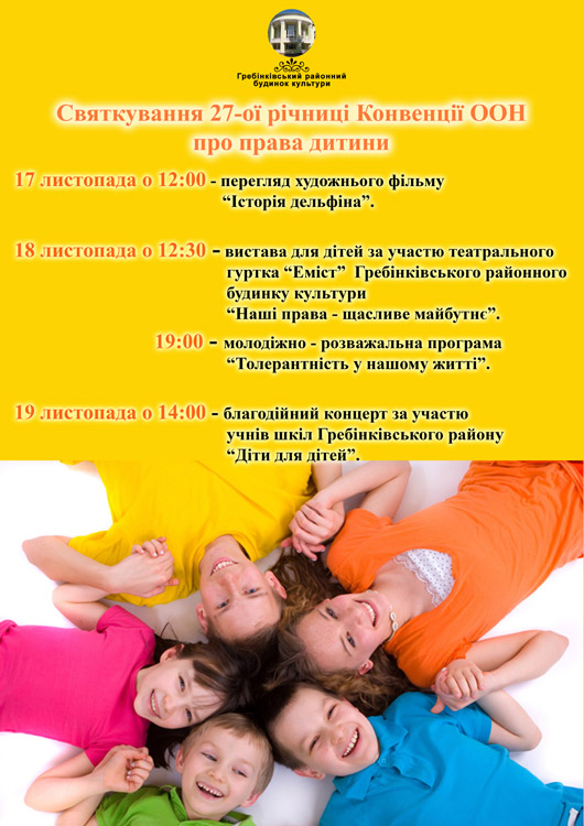 18 листопада о 12:З0 - вистава для дітей за участю театрального гуртка “Еміст” Гребінківського районного будинку культури “Наші права - щасливе майбутнє”.