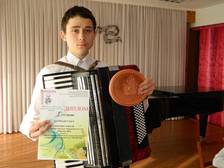 Під патронатом музичної академії ім. Чайковського в м. Кіровоград відбувся ХХІІ Всеукраїнський фестиваль-конкурс виконавців на народних музичних інструментах «ПРОВЕСІНЬ».25 лютого у конкурсному прослуховуванні взяв участь учень Пирятинської школи естетичного виховання Олексій Сергієнко. За оцінками журі хлопець за гру на акордеоні виборов звання Лауреата ІІ премії. Професор консерваторії Євгенія ЧИТАЙТЕ ТАКОЖ: На Гребінківщині відбувся конкурс хорових колективів з виконання української та патріотичної пісні Черказова високо оцінила досягнення пирятинця та надала йому поради, як покращити свою виконавську майстерність. Підписуйтесь на наші оновлення у Facebook, "ВКонтакте" та Twitter: всі найважливіші події Гребінківщини, і не тільки, в одному місці. Пирятинська міська рада