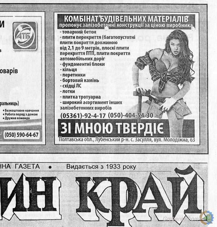 На білборді, який пропонує залізобетонні конструкції, зображена напівоголена жінка. Ще більше шокує напис: «Зі мною твердіє!»