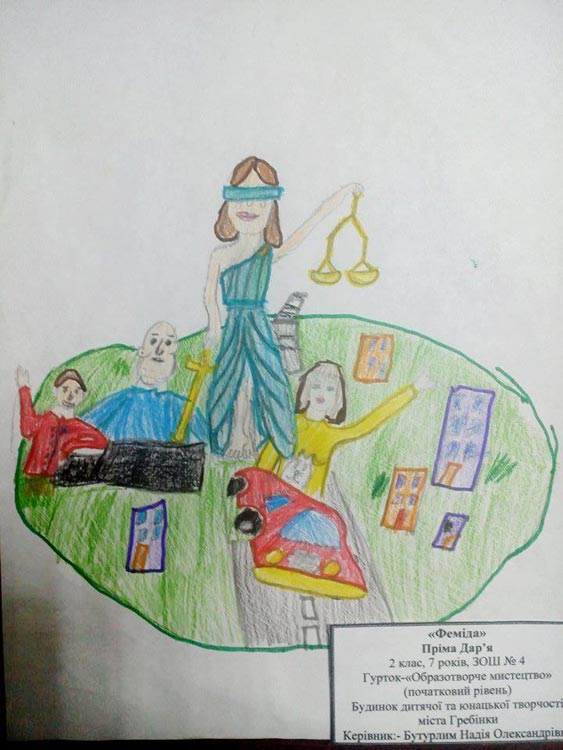 Гребінківський районний суд Полтавської області в рамках проекту «Суд очима дитини» спільно із відділом освіти, молоді та спорту Гребінківської райдержадміністрації серед учнів загальноосвітніх шкіл м.Гребінка та Гребінківського району проводив конкурс малюнків, присвячений Дню працівників суду.Роботи приймалися до 1 грудня 2017 року. Компетентним журі було визначено призові місця, приз глядацьких симпатій дістався тому, хто набрав найбільшу кількість вподобань під час онлайн голосування на сторінці суду в соціальній мережі «Фейсбук». Переможцями конкурсу є: - Пріма Дар'я (учениця гуртка "Образотворче мистецтво" Будинку дитячої та юнацької творчості) - початкові класи. - Ковеня Андрій (учень 6 класу Гребінківської гімназії) - середні класи. - Стрілець Олег (учень Рудківської ЗОШ І-ІІІ ступенів) - старші класи. - Стрілковський В'ячеслав (учень 6 класу Гребінківської гімназії) - приз глядацьких симпатій. Переможців було нагороджено грамотами та подарунками. Для переможця серед старших класів додатковим призом передбачена можливість проведення робочого дня із суддею в рамках проекту "Відкритий суд". ЧИТАЙТЕ ТАКОЖ: На Гребінківщині відзначили День Збройних Сил України Із 7 грудня в приміщенні суду проходить виставка малюнків конкурсантів. Усі відвідувачі мають можливість ознайомитися із дитячими роботами. Працівники Гребінківського районного суду дякують всім учасникам конкурсу "Суд очима дитини". Бажаємо юним талантам натхнення, творчих успіхів та омріяних перемог.