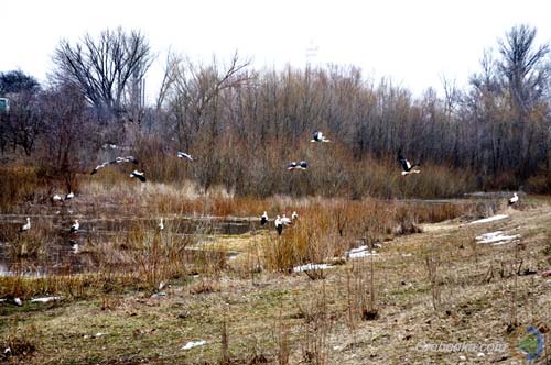 Старий Городищенський став, який ще донедавна пересихав, з розтаванням снігу підняв свій рівень води, і саме це місце декілька днів тому облюбували собі лелеки.