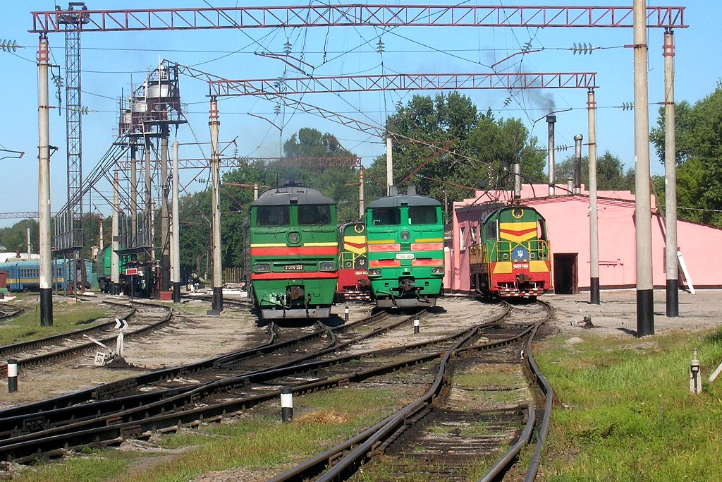 Тепловози 2ТЕ116-1082 та 2ТЕ10УТ-0034 на паливному складі локомотивного депо Гребінка, Південна залізниця