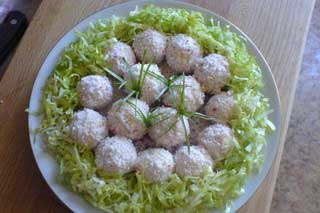 ЧИТАЙТЕ ТАКЖЕ: Салат из красной фасоли, крабовых палочек и сыра Чтобы приготовить Салат "Райское наслаждение" необходимо: Крабовые, яйца и картошку потереть на мелкой терке, залить майонезом и хорошо перемешать. Сыр также потереть на мелкой терке, но в отдельную миску. ЧИТАЙТЕ ТАКЖЕ: Салат "Крабовые Сласти" Из полученной вначале массы делать небольшие шарики ( диаметром около 3 см) и вываливать их в сыре. Выложить на блюдо и поставить в холодильник, чтобы застыли. | ||