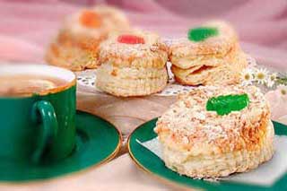 Тістечко листкове з кремом Готують листкове тісто (рецепт «Прісне листкове тісто»).Тісто ділять на дві частини, які розгортають в пласти товщиною 4-6 мм, кладуть їх на вологі листи. Щоб тісто при випічці не здувалося, роблять кілька проколів і витримують 10-15 хвилин. Випікають тісто при 260 ° С. Готовність визначають підняттям одного з куточків: якщо пласт не згинається, значить, він готовий. Потім охолоджують, вирівнюють, обрізки подрібнюють. |