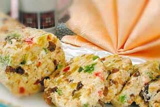 Масло збивають до пишної консистенції.Яйця розтирають з цукром до білого кольору, з'єднують з маслом, додають терту лимонну цедру, лимонний сік, підготовлений родзинки, нарізані кубиками мармелад і подрібнене печиво. Масу добре перемішують і загортають у пергамент, надаючи їй подовжену форму. Витримують у холодильнику 3-4 години. Перед подачею нарізають скибочками і укладають на блюдо. |