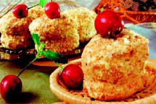 Тістечко " Стіжок " Тісто розкачайте до товщини 4-5 мм. Гострою круглої виїмкою діаметром 5-6 см виріжте коржики по 3-4 штуки на одне тістечко. Розкладіть на змочений водою лист. Випікайте при 260 ° С до рум'яної скоринки. Охолодіть. Для приготування крему масло збийте міксером до однорідної маси, додаючи в 2-3 прийоми згущене молоко. Введіть тертий шоколад, есенцію.Коржики перешарувати приготованим кремом і з'єднайте. Верх і боки тістечок змастіть кремом і обсипте смаженими горіхами. |