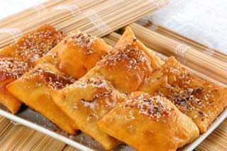Хрустке печиво з кунжутом Кунжут обсмажити при постійному помішуванні до золотистого кольору. Змішати з цукром.Замісити тісто з борошна і 0,5 склянки гарячої води. Розрізати його на 12 однакових шматочків і розкотити квадрати завтовшки 0,8 см. Обсмажити шматочки тесту в розігрітому до 140 ° С маслі, виймати, як тільки на поверхні з'являться бульбашки. Викласти на сито і дати маслу стекти. Гаряче печиво покласти на обробну дошку і посипати кунжутом з цукром. |