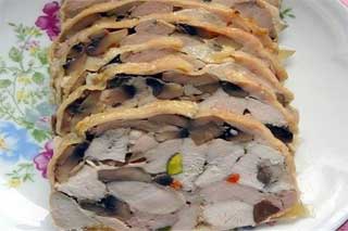 Праздничный куриный рулет с фисташками Куриный рулет можно подавать как праздничное блюдо, а можно просто поставить на стол вместе с гарниром из риса или картофельного пюре. Его пикантный вкус от этого нисколько не пострадает! Снять с курицы кожу (не выбрасывать!), удалить кости и нарезать куриное мясо порционными кусочками. Грибы поджарить и добавить специи. Очищенные фисташки добавить в мясо вместе с жареными грибами, хорошенько все перемешать и завернуть в приготовленную кожу курицы. |